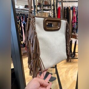 The distinctive brown and cream tones of the Maje Brown and Cream Handbag offer a beautiful blend of texture and color, highlighting the refined appeal of pre-loved designer accessories. This authentic luxury resale piece features a small crossbody silhouette with elegant leather fringe and durable canvas construction, finished with a practical magnetic closure. Carefully curated for women’s consignment fashion, this handbag is in very good condition, making it a remarkable addition to any collection. Experience the blend of contemporary design and timeless style that only Maje can deliver.