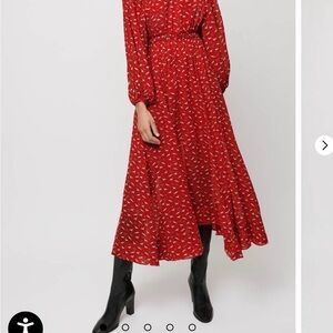 Chic red dress with long sleeves. Features a stylish pattern. Perfect for versatile wear. Tagged size FR 38 or US Medium but can fit large. Elastic waist. I recently had dry cleaned. Worn 1x