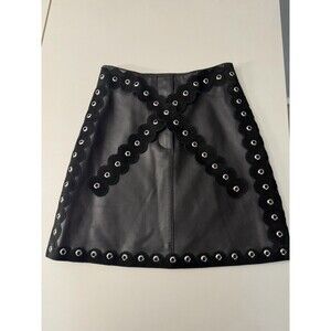 The Maje Jarisco Jupe Coir Black Leather Mini Skirt with Suede Accent Trim in size 34 is a stylish and versatile piece perfect for various occasions such as travel, parties, or casual outings. Made of matte leather with a high rise and grommet trim accents, this skirt features a zipper closure and is lined for added comfort. The black color and solid pattern make it a wardrobe staple that can be worn in all seasons, adding a touch of edgy biker-inspired flair to any outfit. Ideal for a fashionable and trendy look. Measures 24 waist, 30 hips and 16.5 length! NWT and really cute!