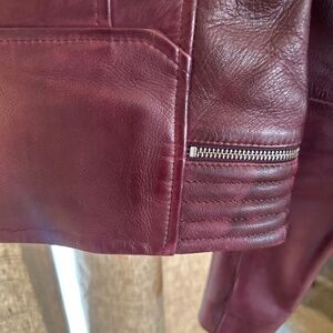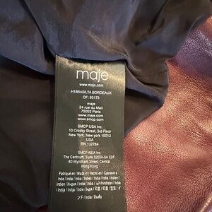 Beautiful Burgundy Maje Moto Jacket. Cropped with quilted waist; fully lined. There are two water marks under the right arm.