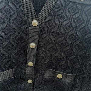 This stunning Maje Madeline cardigan is crafted from a warm, thick jacquard knit featuring metallic, shimmering motifs. Designed in a straight, midi-inspired silhouette, it offers effortless elegance with a luxe feel. The V-neckline, long sleeves, and signature gold-tone Maje Clover buttons add a refined finish, while four front pockets bring both style and functionality. Note: The name-brand tag is missing.