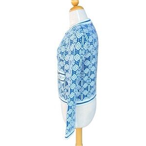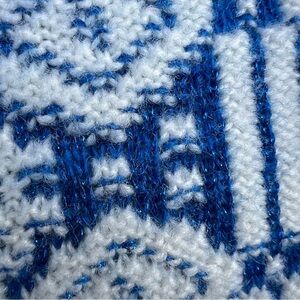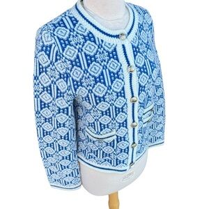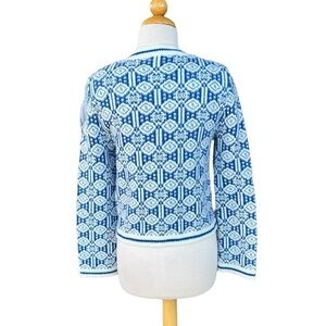 Maje Melance Geometric Jacquard Knit Jumper Cardigan. Women’s size 2 (US Medium). Blue and White with Metallic thread. Ribbed neckline, placket and hem with decorative buttons.