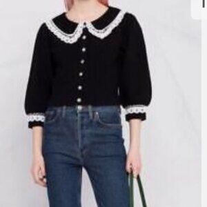 Maje Mirandal Lace Trim Collared Cardigan Sweater Black Size 2