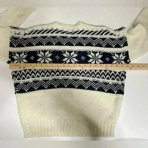 Crewneck, drop shoulders, long sleeves Front geo pattern, open knit at sleeves Allover texture, ribbed trims