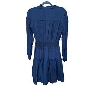 Elevate your wardrobe with this effortlessly chic Maje mini dress in classic navy blue. Designed with a soft tiered silhouette, this long sleeve dress features romantic gathered details, a smocked waist for a flattering shape, and a feminine high neckline with a delicate tie-front bow and subtle keyhole. The lightweight viscose-blend fabric gives it graceful movement, perfect for everything from fall brunches to holiday parties.