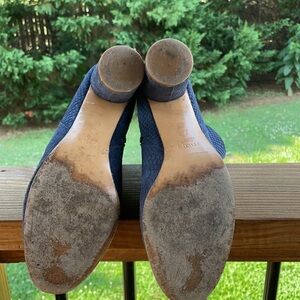 Fun navy textured suede booties. Inner zipper. Chunky heel. Signs of wear throughout with lots of life left