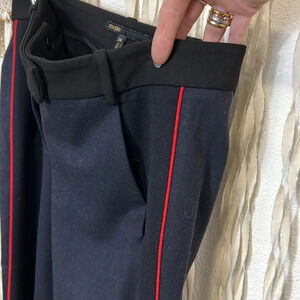 Mid rise, trouser style pockets, zip and button closure. Black and navy with red accent