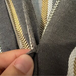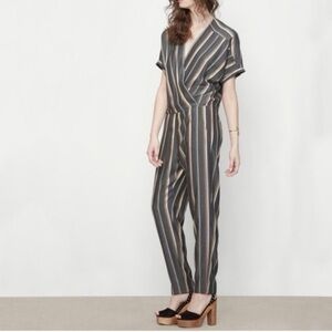 Features: side pockets. Surplice v neckline. Slim leg. Cuffed sleeve