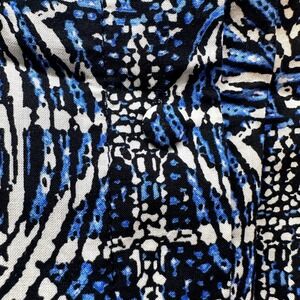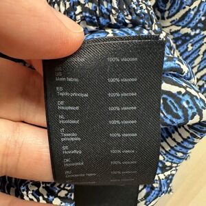 Keywords: Maje, mini dress, abstract print, blue dress, white dress, smocked waist, ruffled hem, 3/4 sleeve dress, womens dress, size 40, viscose dress, casual dress, party dress, boho dress