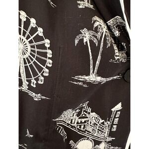 Keywords: Maje, Black, White, Printed, Blouse, Top, Long Sleeve, Button Down, Size Small, Contemporary, Designer, Parisian, Ferris Wheel, Palm Tree, Buildings