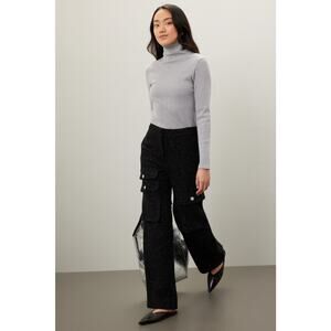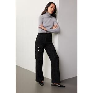 Black tweed (52% cotton, 32% acrylic, 12% polyester, 2% other fibers, 2% Metalized fibers). Pants. Front button fly closure. 31" inseam. 14" rise. Imported.