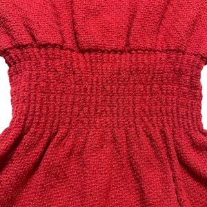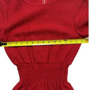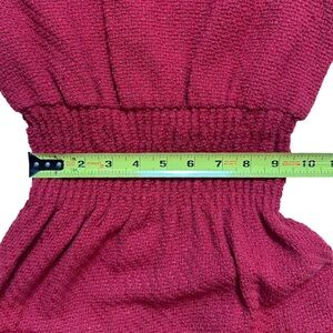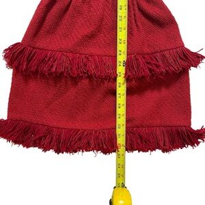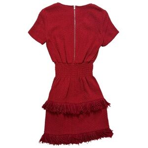 Round neckline, short sleeves, smocked waist Tiered fringe at skirt, exposed back zip closure.