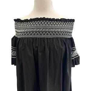 Beautiful black dress with white accent stitching. Stretchy neckline meant to be worn off the shoulder. Cottage/nordic feel to stitching. Beautiful dress!