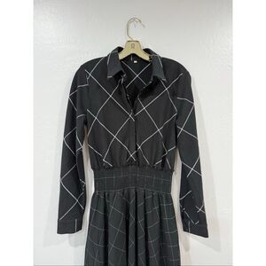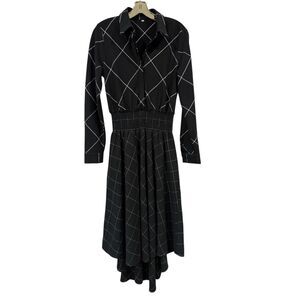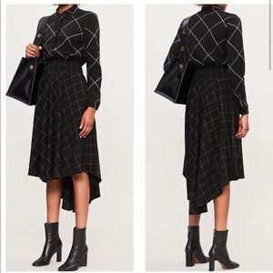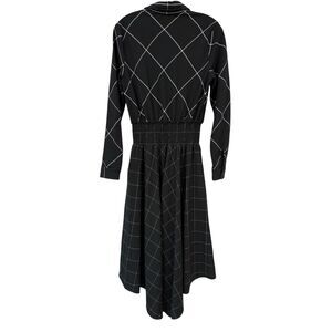 Maje long sleeve checked dress with smocked waist and asymmetrical skirt.