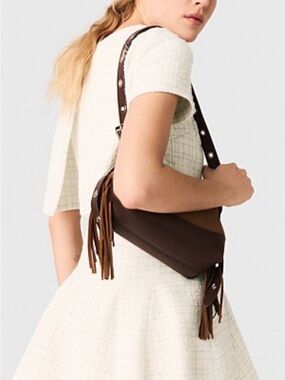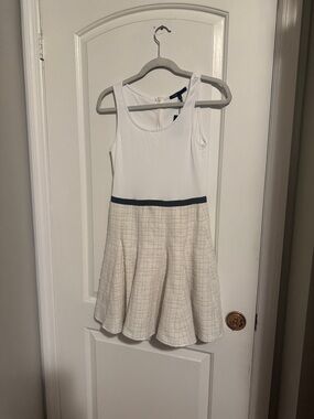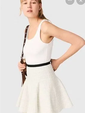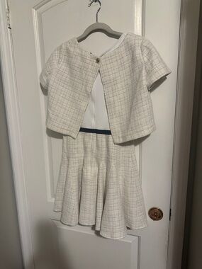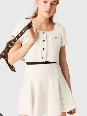 Elegant ivory tweed mini dress with a cropped bodice and short sleeves. Features decorative front buttons and a subtle textured weave. Feminine flared skirt for easy movement and a polished look. Perfect for daytime events and smart-casual occasions.byb 4
