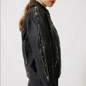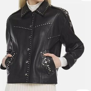 Wear with matching leather shorts for an ultra-glam out-of-the-way biker-meets look. Lined. Studded tightening tabs at shoulders. Zipped sleeves and pleats with studs. Flap pockets decorated at the waist. Imported. Htf