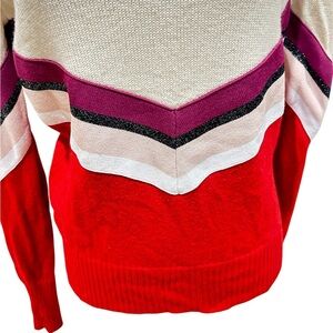make 100% wool ski sweater with chevron pattern. Features red, cream, with burgundy black metallic stripe accents. Apres ski. Ski. Snow. Euc