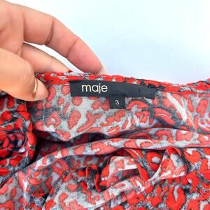 Elegant red mini dress with floral pattern. Features wrap design and ruffled hem. Long sleeves for a stylish look.