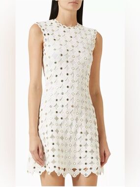 Chic white crochet lace mini dress. Sleeveless with scalloped hem. Feminine and elegant. Perfect for parties or brunch.by 3