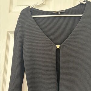 Chic black blouse with a deep V-neck. Long sleeves and fitted design. Ideal for stylish outings.