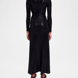 Elevate your evening wear with the Maje Rilexisa gown, a dazzling black masterpiece adorned with sequins that catch the light beautifully. Its body-skimming silhouette features a sophisticated pleated side cutout and a thigh-high side slit for an alluring touch. The round neckline and long sleeves add elegance, making it perfect for formal occasions. Crafted from a blend of nylon, polyamide, polyester, and elastane, it combines comfort with style. This gown is pre-owned but remains in perfect condition and is hand-washable for easy care.