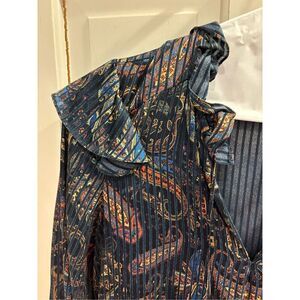 Maje jacquard dress with a paisley print, ruffled details and tie at the collar. Shift cut, ruffled hem