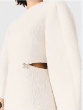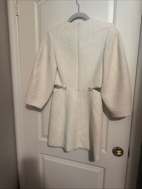 Elegant white bouclé mini dress with sculpted balloon sleeves. Designed with subtle waist details for a flattering silhouette. Soft textured fabric offers comfortable, polished wear. Perfect for events or upscale daytime looks.byb 4