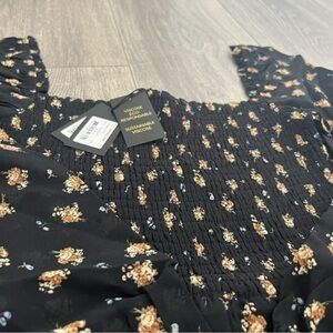 Maje smocked floral print dress featuring a square neck at the front and back and long sleeves. Smocked bodice and cuffs.