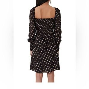 Maje smocked floral print dress featuring a square neck at the front and back and long sleeves. Smocked bodice and cuffs.