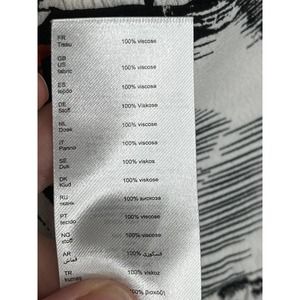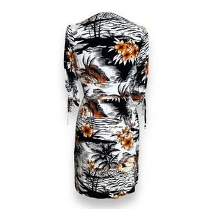 MAJE Rolina Dress with retro 40s styling in graphic black and white Hawaiian tropical print with button down front, POCKETS, and ties at elbows in EXCELLENT USED CONDITION, Maje Paris Size 1, or WOMEN'S US SIZE SMALL (This is approximate - as this is French sizing please refer to measurements below as well as suggested body measurements from Maje Paris next to last photo).