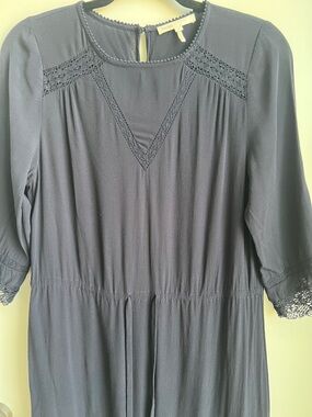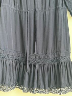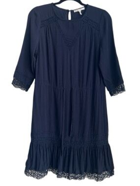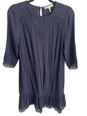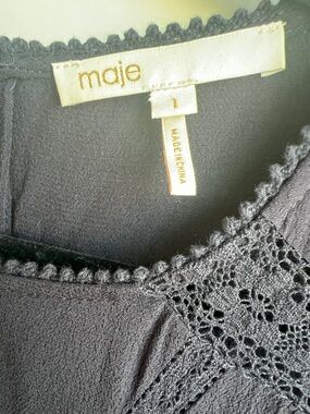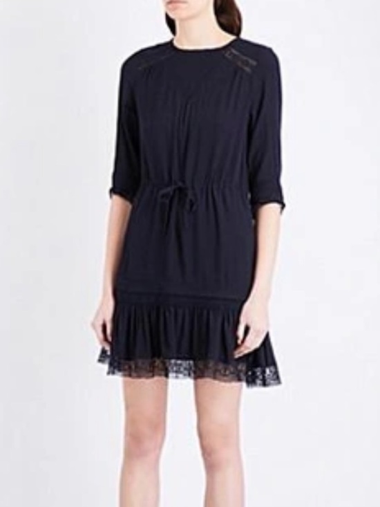 Maje Ronsard Crepe Mini Dress in Nuit is a lightweight, fluid crepe dress featuring delicate lace panels on the sleeves and hem, a drawstring waist, and a flirty, feminine silhouette. It is a versatile French-style shift dress often described as a "French Peasant" style with a modern, chic twist.