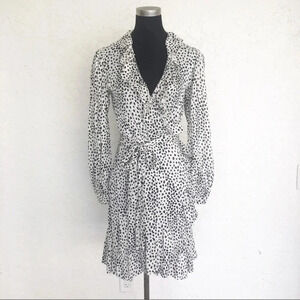 Make Rosana wrap dress in black and white leopard print. V neck with ruffle trim. Long sleeves with button closure. Self tie waist closure. Bust 17” length 36”. Excellent condition. Size 1 Maje Size S