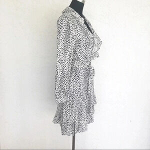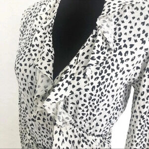 Make Rosana wrap dress in black and white leopard print. V neck with ruffle trim. Long sleeves with button closure. Self tie waist closure. Bust 17” length 36”. Excellent condition. Size 1 Maje Size S