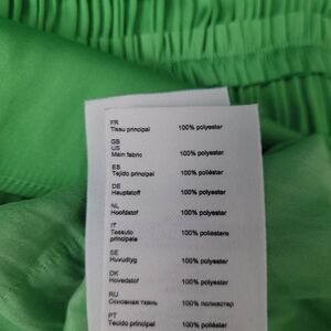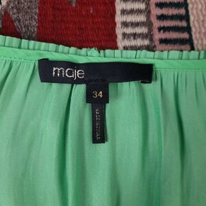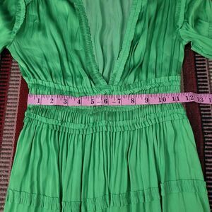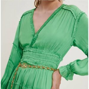 Maje Pleated Mini Dress in Light Green, deep plunging v-neck, puffy Long Sleeves, Satin Silky feel, smocked elasticized waist, tiered pleated skirt, unlined, 100% Polyester.