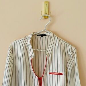 Stylish Maje 100% supremely soft silk shirt with vertical stripes. White base with red piping detailing. Perfect for elegant and casual outings. An elegant and sophisticated piece that can be worn with a skirt, under a fitted blazer or with jeans for a cool but sophisticated look.