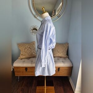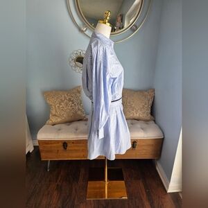 This Maje dress embodies casual sophistication with its crisp blue and white pinstripes. The relaxed shirt paired with a flirty pleated skirt offers a playful yet polished look.