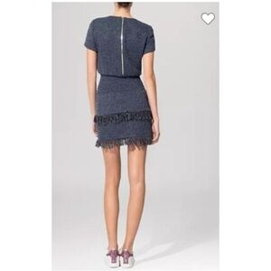 Slate Maje short sleeve mini dress with tweed pattern throughout, fringe accents at skirt and zip closure at back. Designer size 1.