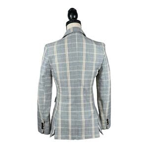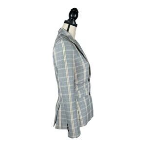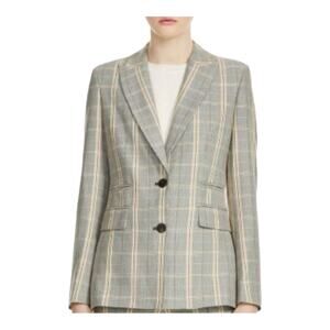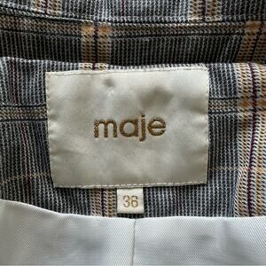 Maje Valila Plaid Blazer Jacket in a size 38 FR which is a size US small. Has a slim fit. Peak labels, button cuffs. Two front button closure. Two side flap pockets and two slit pockets. Flap vent. Fully lined. Polyester/viscose/elastane. Measures approximately 16 1/2” armpit to armpit, and 25” in length. In great condition.