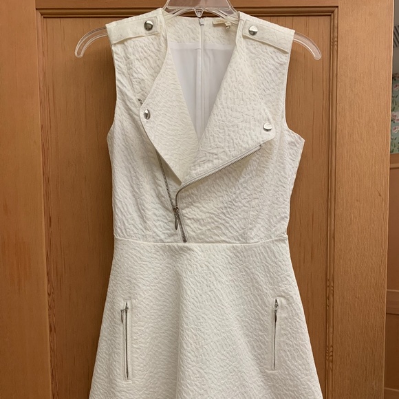 worn twice, excellent condition, white sleeveless dress, silver snap and asymmetric zipper detailing, two zipper pockets on skirt front, back zipper closure, size 2=medium