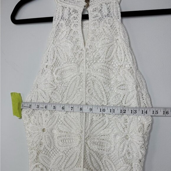 This maxi dress is made from intricate openwork crochet-knit guipure, with textured floral embroidery and delicate bronze studs for a high-impact, luxurious finish.