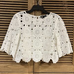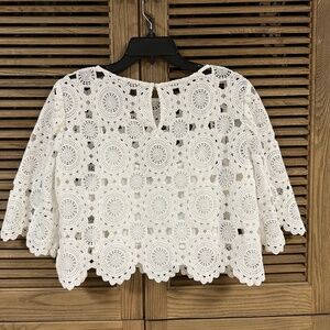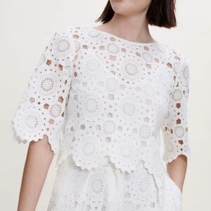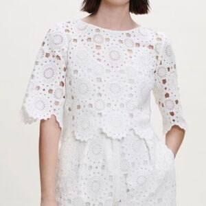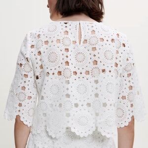 Short, loose-fitting top. Short, wide sleeves. Cotton guipure lace.