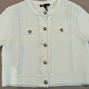 Elegant white cardigan with intricate knit design. Features a stylish button closure.