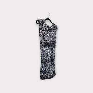Fitted knit dress featuring a black, white, and tan abstract pattern. Sleeveless with stretch fabric that contours the body for a sculpted silhouette.