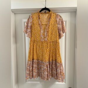 Vibrant floral dress by Maje. Features yellow and purple patterns. Ideal for sunny days.