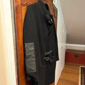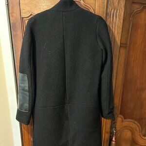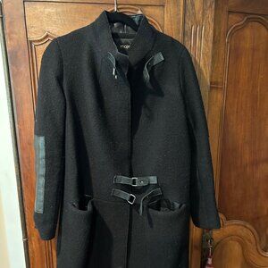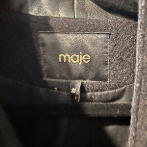 Stylish and modern Maje black boiled wool and leather short coat, European size 39. Maje is known for its timeless elegance and unparalleled French-girl style. Maje's clothing is made with quality materials that not only offer exceptional warmth but also exude a sense of luxury and sophistication. Elevate your outerwear game with this Maje wool and leather coat! The one drawback is that the leather straps don't always stay closed, but you can wear the coat open and still look cool. I'm open to all counteroffers.