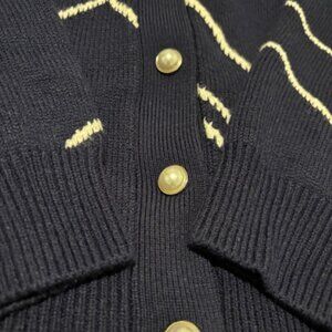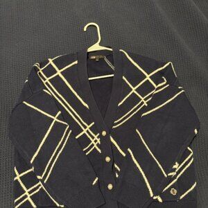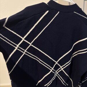 Chic dark blue cardigan with white argyle pattern. Features white pearl button closure and front pockets. Excellent condition. Size 3 is an oversized Large.