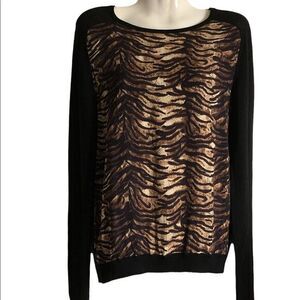 Maje top Size 2 100% Merino Wool Mixed Media animal print w solid back pullover