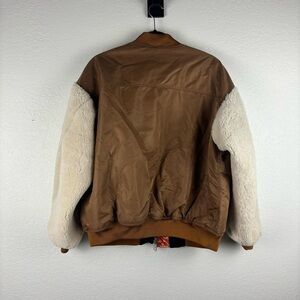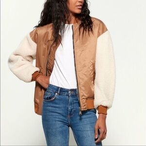 Front zip closure, ribbed knit trim, bomber style, shearling Sherpa sleeves, front pockets. Caramel brown tan, cream sleeves. Lined. As seen on Gigi Hadid. Casual, trendy, neutral. Size 40 / Large on Maje Size Chart.