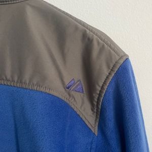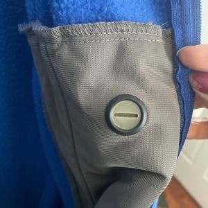 MLB Chicago Cubs super soft full zip fleece jacket in blue and gray. This jacket has so many cool features! Two huge zipper pockets on the sides of the chest. One of the sides has a clip in pass holder. Perfect for your on field pass. The second pocket has a hole to put your headphones or ear buds through. Cubs logo embroidered on the shoulder and the mock neck collar.