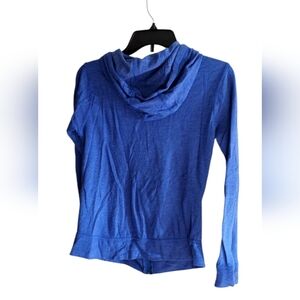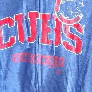 Blue hoodie featuring Chicago Cubs logo in red and white. measurements approx armpit to armpit 18 inches length 22 inches